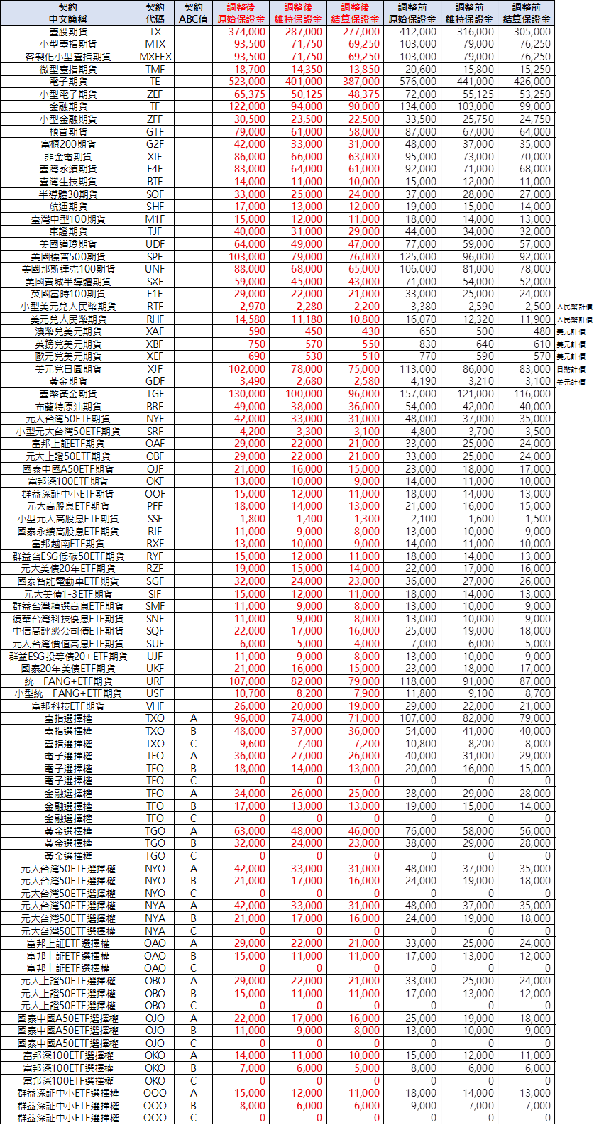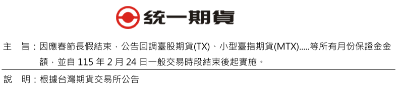 保證金調整通知 【公告】因應春節長假結束,公告回調臺股期貨(TX)、小型臺指期貨(MTX).....等所有月份保證金金額,並自115年2月24日一般交易時段結束後起實施。 發表時間:2026.02.23 主 旨:因應春節長假結束,公告回調臺股期貨(TX)、小型臺指期貨(MTX).....等所有月份保證金金額,並自115年2月24日一般交易時段結束後起實施。 回列表