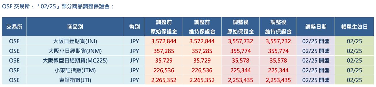 JPX交易所,「02/25」部分商品調整保證金