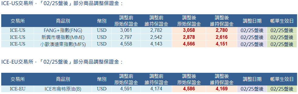 CBOT、CME、NYMEX、ICE-US、ICE-EU 交易所「02/25盤後」部分商品調整保證金