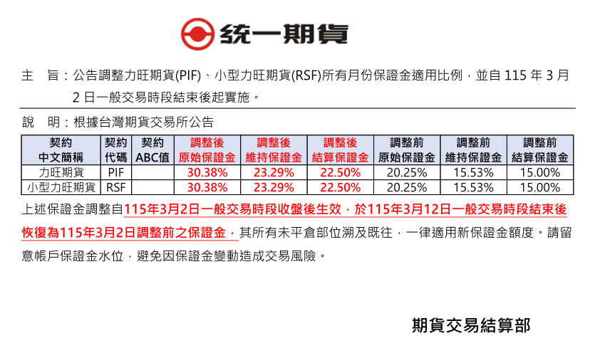 保證金調整通知 【公告】調整力旺期貨(PIF)、小型力旺期貨(RSF)所有月份保證金適用比例,並自115年3月2日一般交易時段結束後起實施。 發表時間:2026.02.26 主 旨:公告調整力旺期貨(PIF)、小型力旺期貨(RSF)所有月份保證金適用比例,並自115年3月2日一般交易時段結束後起實施。 回列表