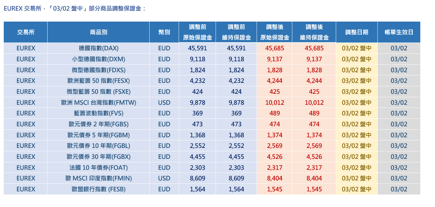 EUREX交易所,「03/02 盤中」部分商品調整保證金