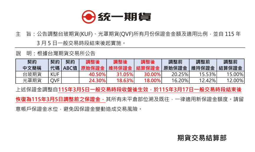 保證金調整通知 【公告】調整台玻期貨(KUF)、光罩期貨(QVF)所有月份保證金金額及適用比例,並自115年3月5日一般交易時段結束後起實施。 發表時間:2026.03.04 主 旨:公告調整台玻期貨(KUF)、光罩期貨(QVF)所有月份保證金金額及適用比例,並自115年3月5日一般交易時段結束後起實施。 回列表