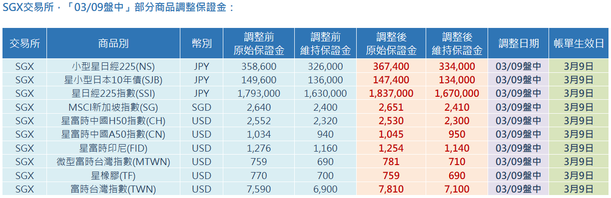 SGX交易所,「03/09盤中」部分商品調整保證金