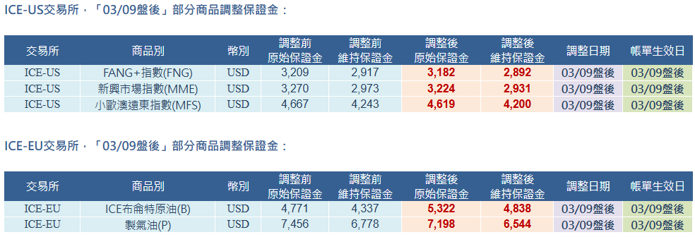 CBOT、CME、NYMEX、ICE-US、ICE-EU 交易所「03/09盤後」部分商品調整保證金