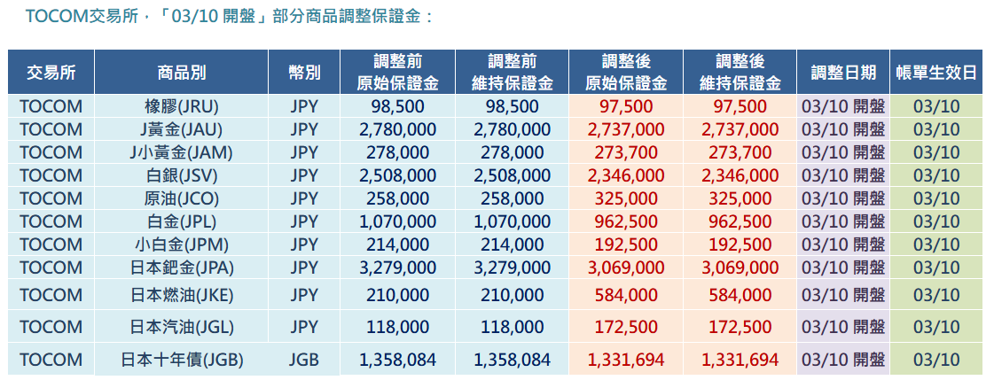 OSE、TOCOM交易所,「03/10」部分商品調整保證金