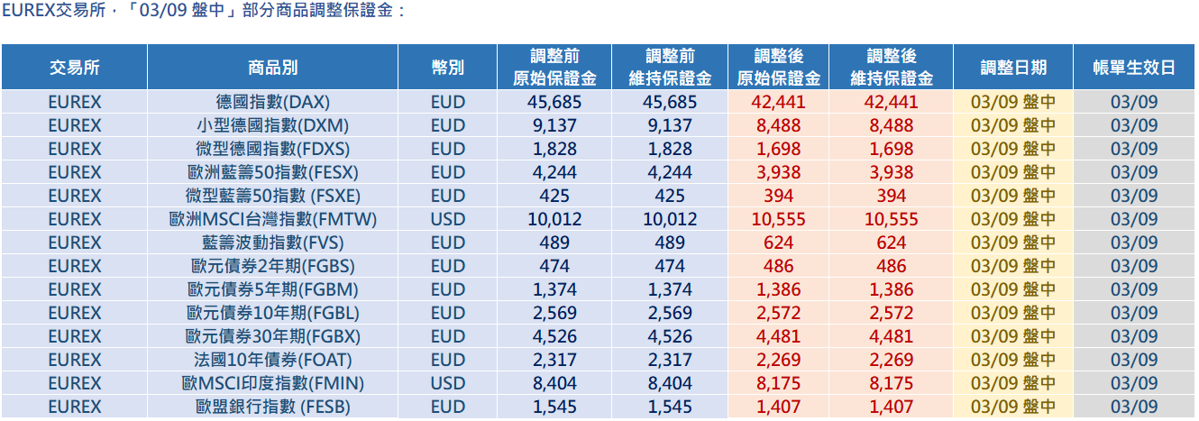 EUREX交易所,「03/09 盤中」部分商品調整保證金