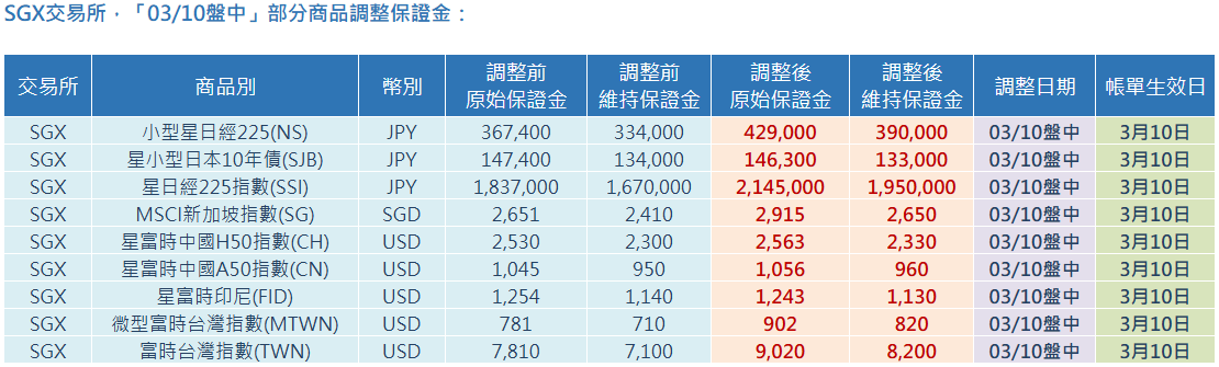 SGX交易所,「03/10盤中」部分商品調整保證金