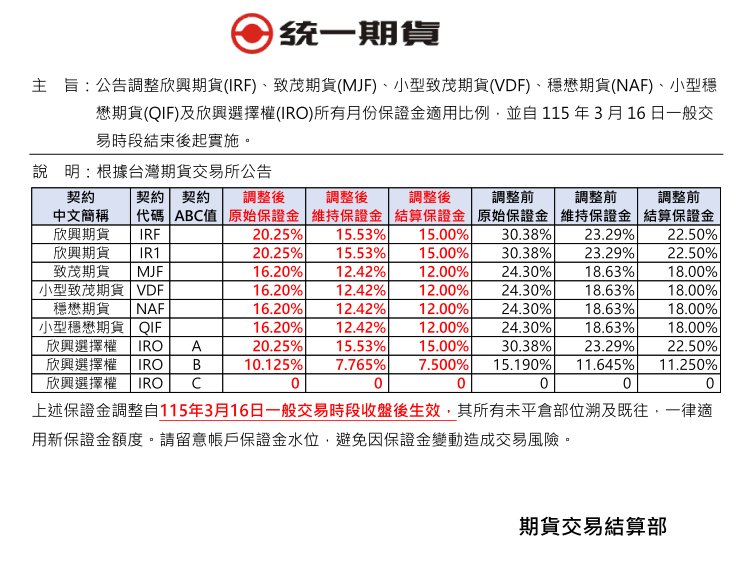 保證金調整通知 【公告】調整欣興期貨(IRF)、致茂期貨(MJF)、小型致茂期貨(VDF)、穩懋期貨(NAF)、小型穩懋期貨(QIF)及欣興選擇權(IRO)所有月份保證金適用比例,並自115年3月16日一般交易時段結束後起實施。 發表時間:2026.03.13 主 旨:公告調整欣興期貨(IRF)、致茂期貨(MJF)、小型致茂期貨(VDF)、穩懋期貨(NAF)、小型穩懋期貨(QIF)及欣興選擇權(IRO)所有月份保證金適用比例,並自115年3月16日一般交易時段結束後起實施。 回列表