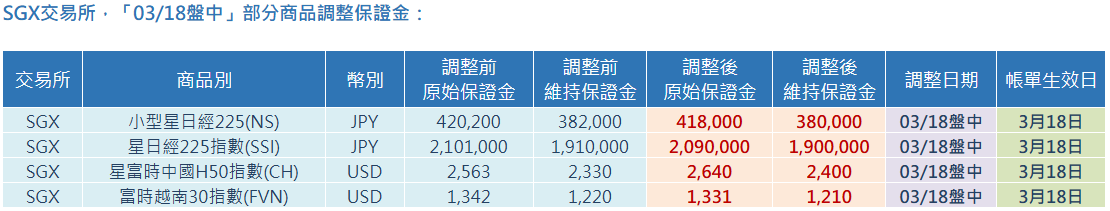 SGX交易所,「03/18盤中」部分商品調整保證金