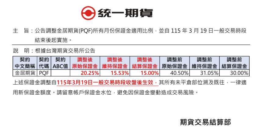 保證金調整通知 【公告】調整金居期貨(PQF)所有月份保證金適用比例,並自115年3月19日一般交易時段結束後起實施。 發表時間:2026.03.18 主 旨:公告調整金居期貨(PQF)所有月份保證金適用比例,並自115年3月19日一般交易時段結束後起實施。 回列表