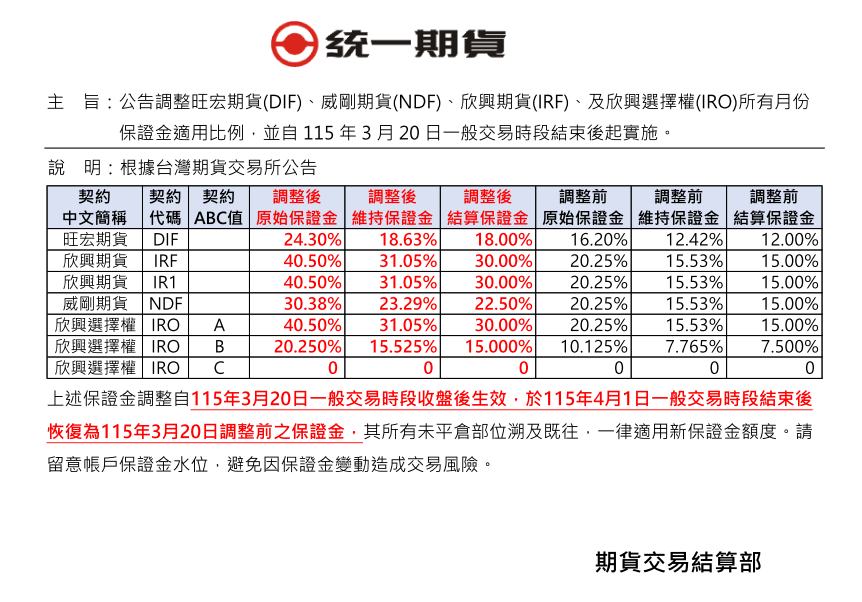 保證金調整通知 【公告】調整旺宏期貨(DIF)、威剛期貨(NDF)、欣興期貨(IRF)、及欣興選擇權(IRO)所有月份保證金適用比例,並自115年3月20日一般交易時段結束後起實施。 發表時間:2026.03.19 主 旨:公告調整旺宏期貨(DIF)、威剛期貨(NDF)、欣興期貨(IRF)、及欣興選擇權(IRO)所有月份保證金適用比例,並自115年3月20日一般交易時段結束後起實施。 回列表