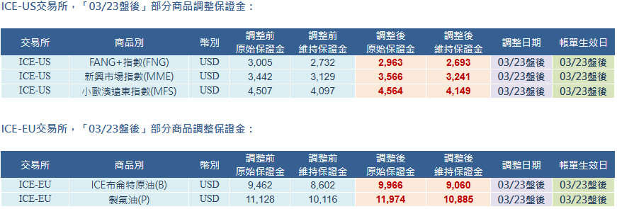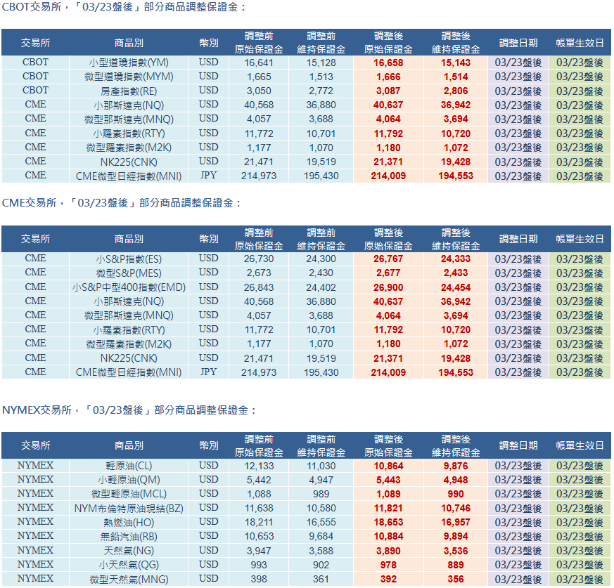 CBOT、CME、NYMEX、ICE-US、ICE-EU 交易所「03/23盤後」部分商品調整保證金