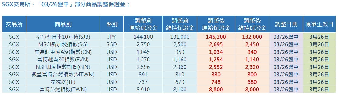 SGX交易所,「03/26盤中」部分商品調整保證金