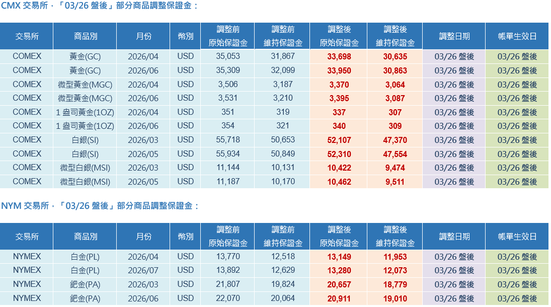 交易提醒:NYMEX、COMEX 交易所「03/26盤後」部分商品調整保證金