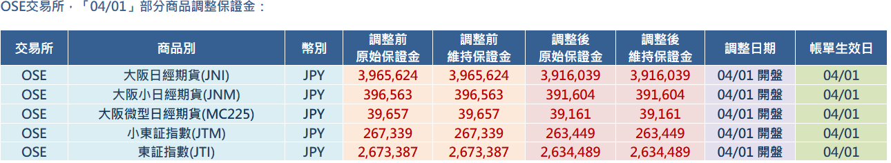 OSE交易所,「04/01」部分商品調整保證金