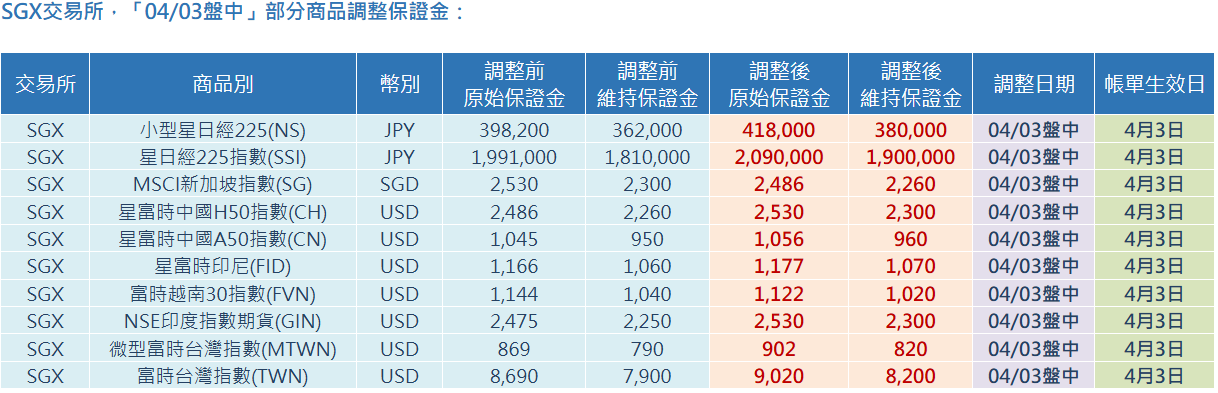 SGX交易所,「04/03盤中」部分商品調整保證金