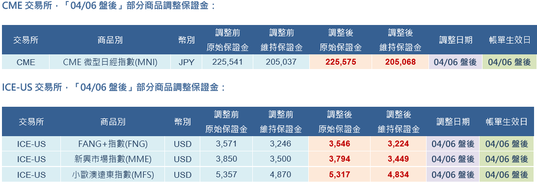 CME、ICE-US 交易所「04/06盤後」部分商品調整保證金