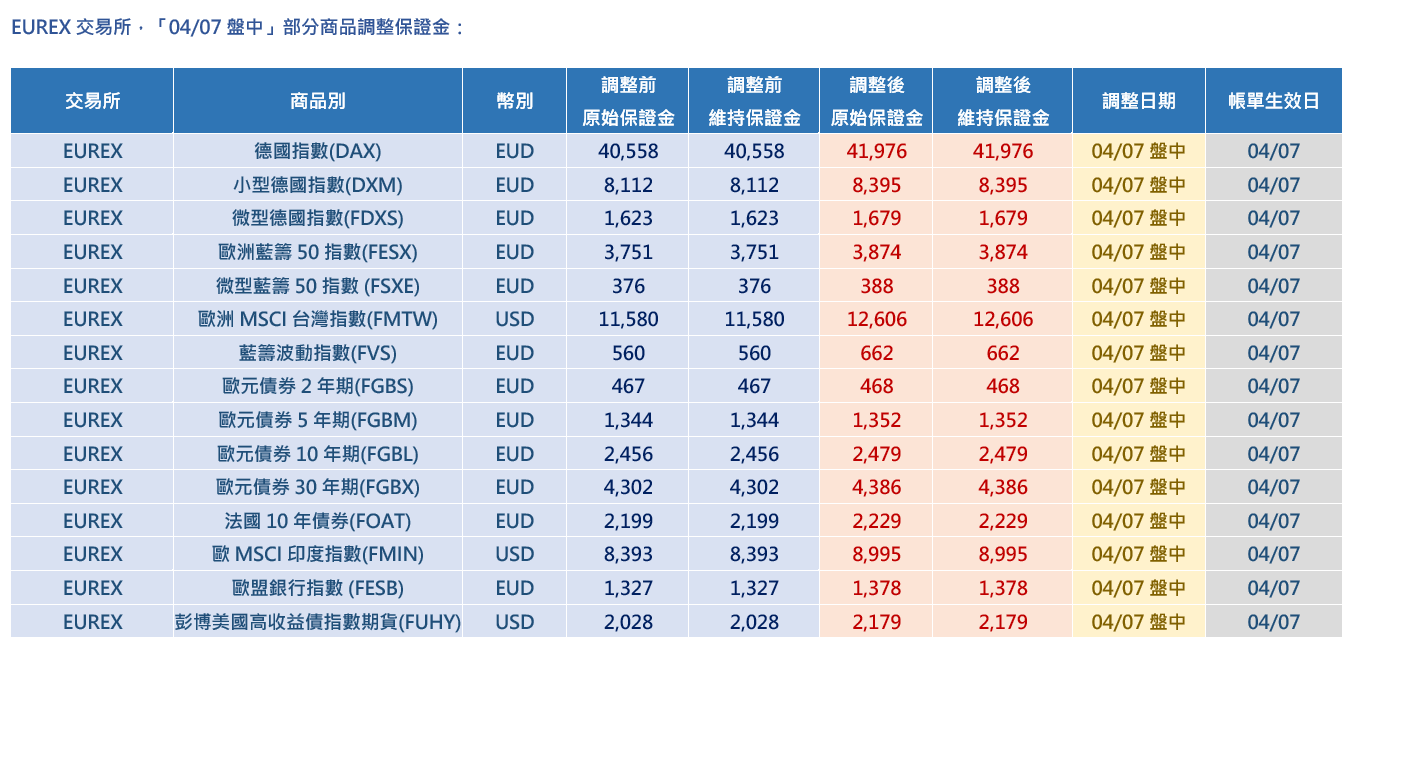 EUREX交易所,「04/07 盤中」部分商品調整保證金