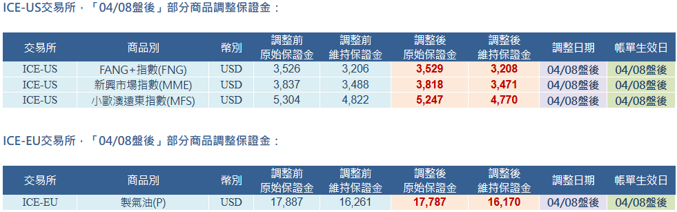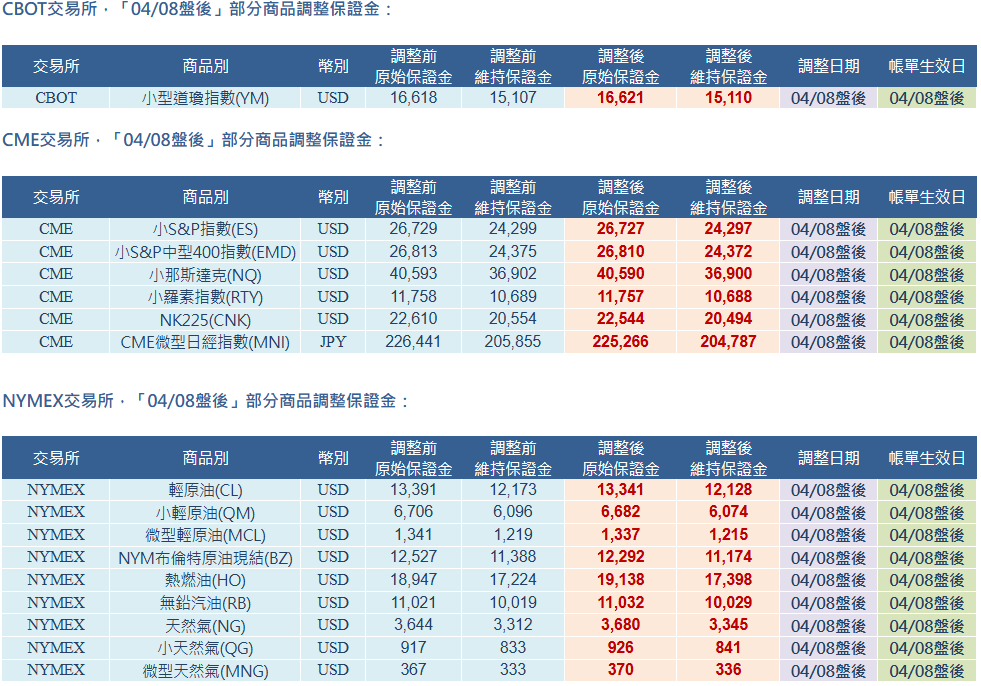 CBOT、CME、NYMEX、ICE-US、ICE-EU 交易所「04/08盤後」部分商品調整保證金