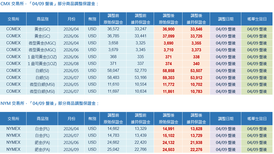 交易提醒:NYMEX、COMEX 交易所「04/09盤後」部分商品調整保證金