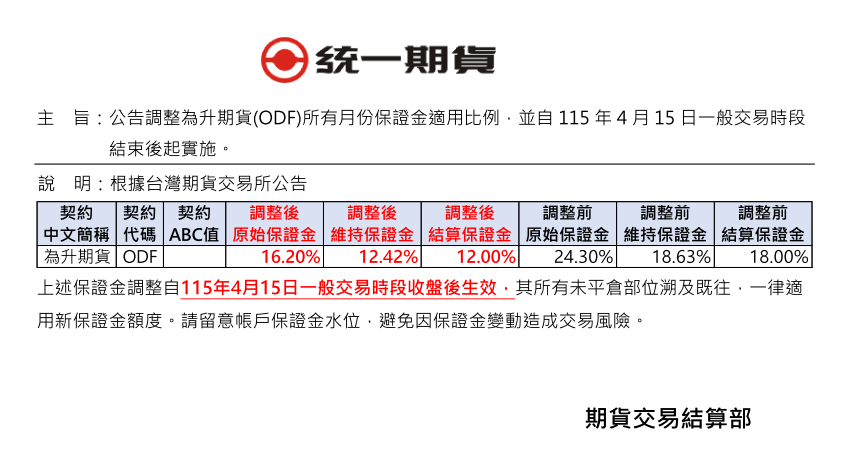保證金調整通知 【公告】調整為升期貨(ODF)所有月份保證金適用比例,並自115年4月15日一般交易時段結束後起實施。 發表時間:2026.04.14 主 旨:公告調整為升期貨(ODF)所有月份保證金適用比例,並自115年4月15日一般交易時段結束後起實施。 回列表