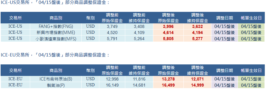 CBOT、CME、NYMEX、ICE-US、ICE-EU 交易所「04/15盤後」部分商品調整保證金