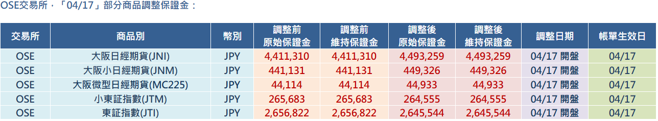 OSE交易所,「04/17」部分商品調整保證金