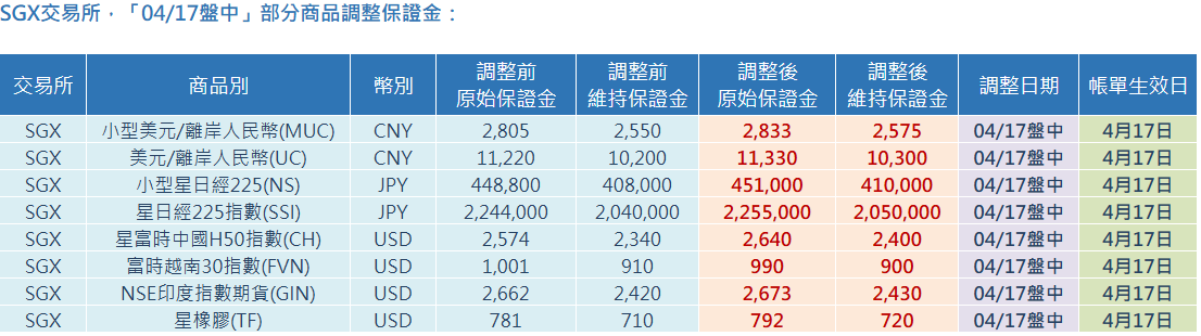 SGX交易所,「04/17盤中」部分商品調整保證金