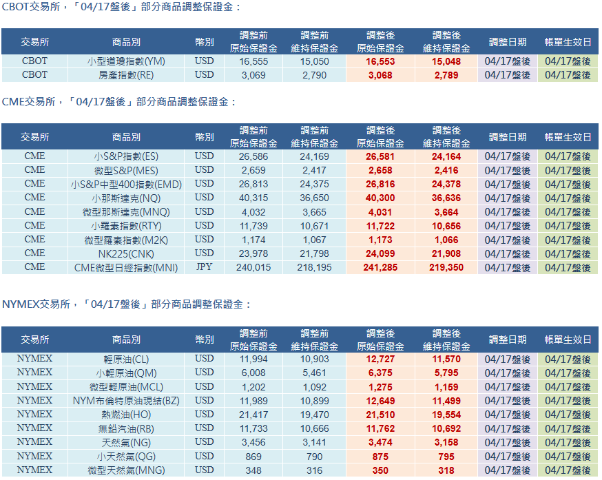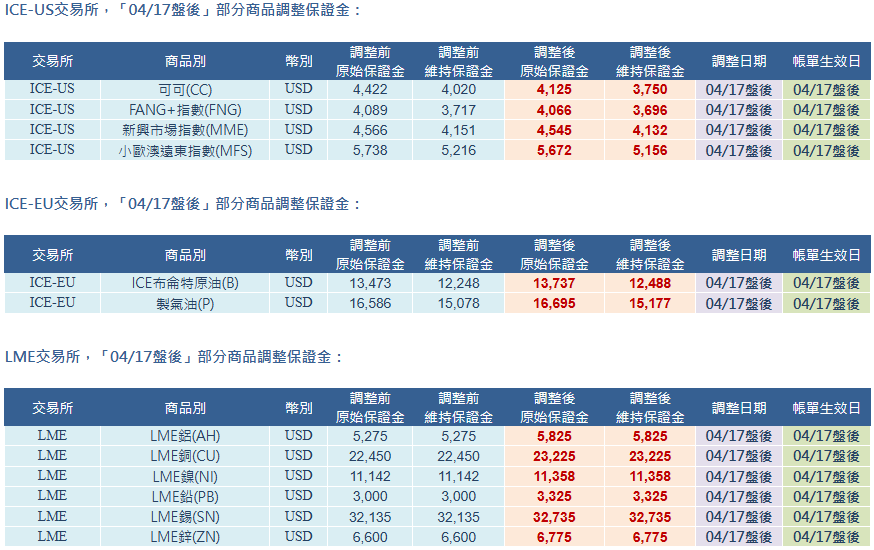 CBOT、CME、NYMEX、ICE-US、ICE-EU、LME 交易所「04/17盤後」部分商品調整保證金