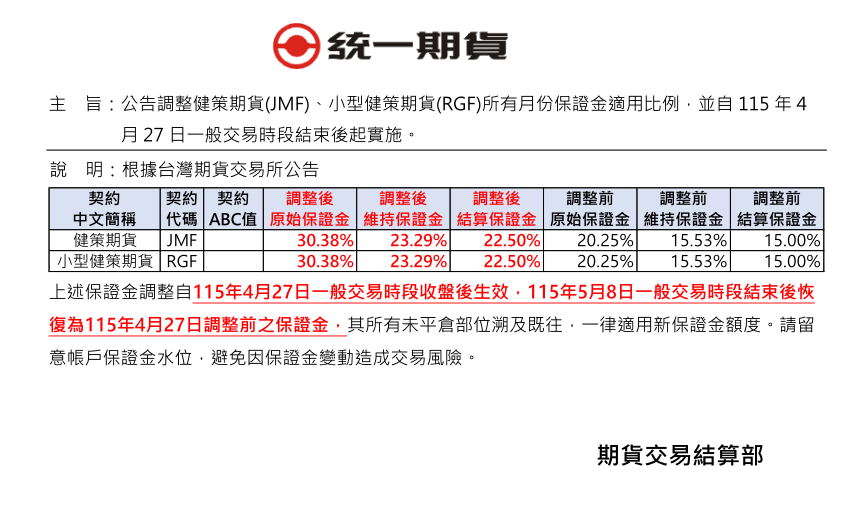 保證金調整通知 【公告】調整健策期貨(JMF)、小型健策期貨(RGF)所有月份保證金適用比例,並自115年4月27日一般交易時段結束後起實施。 發表時間:2026.04.24 主 旨:公告調整健策期貨(JMF)、小型健策期貨(RGF)所有月份保證金適用比例,並自115年4月27日一般交易時段結束後起實施。 回列表