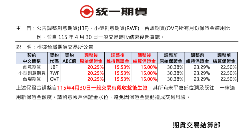 保證金調整通知 【公告】調整創意期貨(JBF)、小型創意期貨(RWF)、台燿期貨(OVF)所有月份保證金適用比例,並自115年4月30日一般交易時段結束後起實施。 發表時間:2026.04.29 主 旨:公告調整創意期貨(JBF)、小型創意期貨(RWF)、台燿期貨(OVF)所有月份保證金適用比例,並自115年4月30日一般交易時段結束後起實施。 回列表