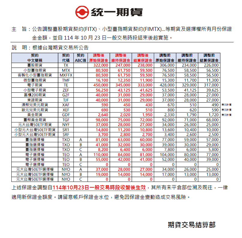 最新消息 【公告】調整臺股期貨契約(FITX)、小型臺指期貨契約(FIMTX)...等期貨及選擇權所有月份保證金金額,並自114年10月23日一般交易時段結束後起實施。 發表時間:2025.10.22 主 旨:公告調整臺股期貨契約(FITX)、小型臺指期貨契約(FIMTX)...等期貨及選擇權所有月份保證金金額,並自114年10月23日一般交易時段結束後起實施。 回列表