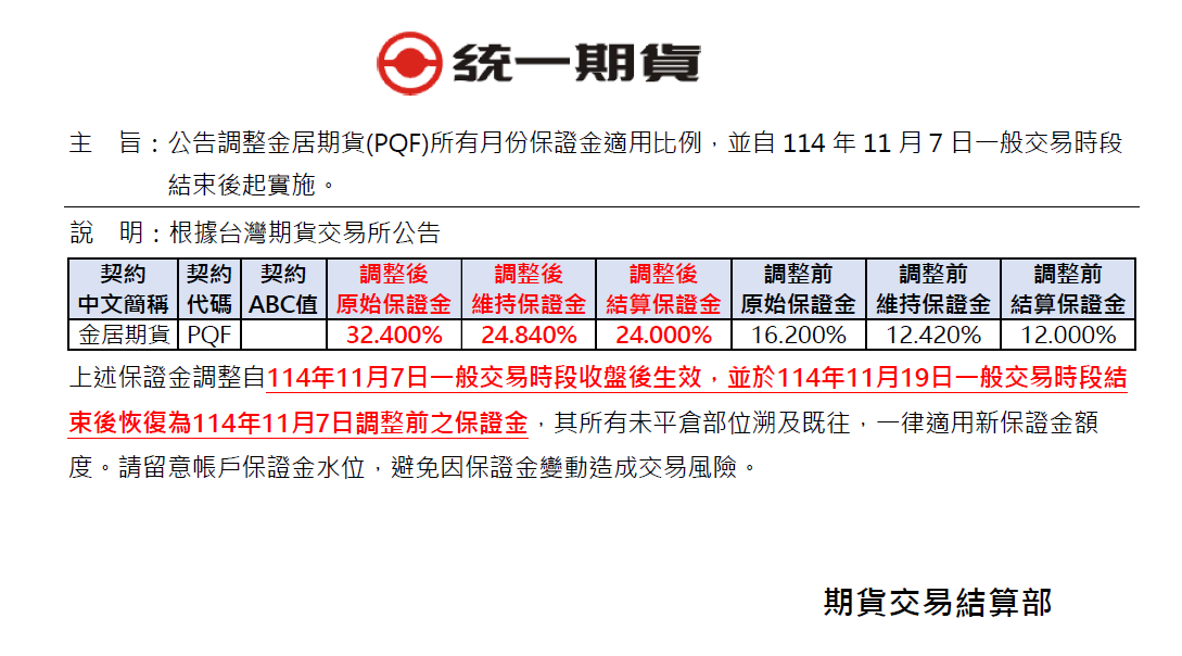 最新消息 【公告】調整金居期貨(PQF)所有月份保證金適用比例,並自114年11月7日一般交易時段結束後起實施。 發表時間:2025.11.06 主 旨:公告調整金居期貨(PQF)所有月份保證金適用比例,並自114年11月7日一般交易時段結束後起實施。 回列表