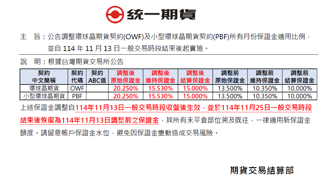 最新消息 【公告】調整環球晶期貨契約(OWF)及小型環球晶期貨契約(PBF)所有月份保證金適用比例,並自114年11月13日一般交易時段結束後起實施。 發表時間:2025.11.12 主 旨:公告調整環球晶期貨契約(OWF)及小型環球晶期貨契約(PBF)所有月份保證金適用比例,並自114年11月13日一般交易時段結束後起實施。 回列表