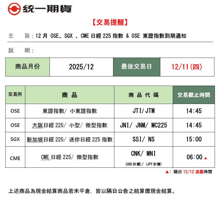 【交易提醒】12月份OSE,SGX,CME日經225指數&OSE東證指數商品最後交易日