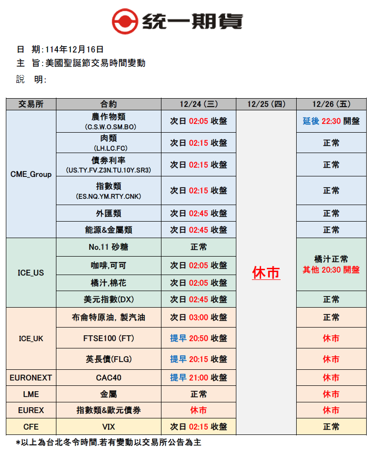 【交易提醒】美國聖誕節交易時間變動