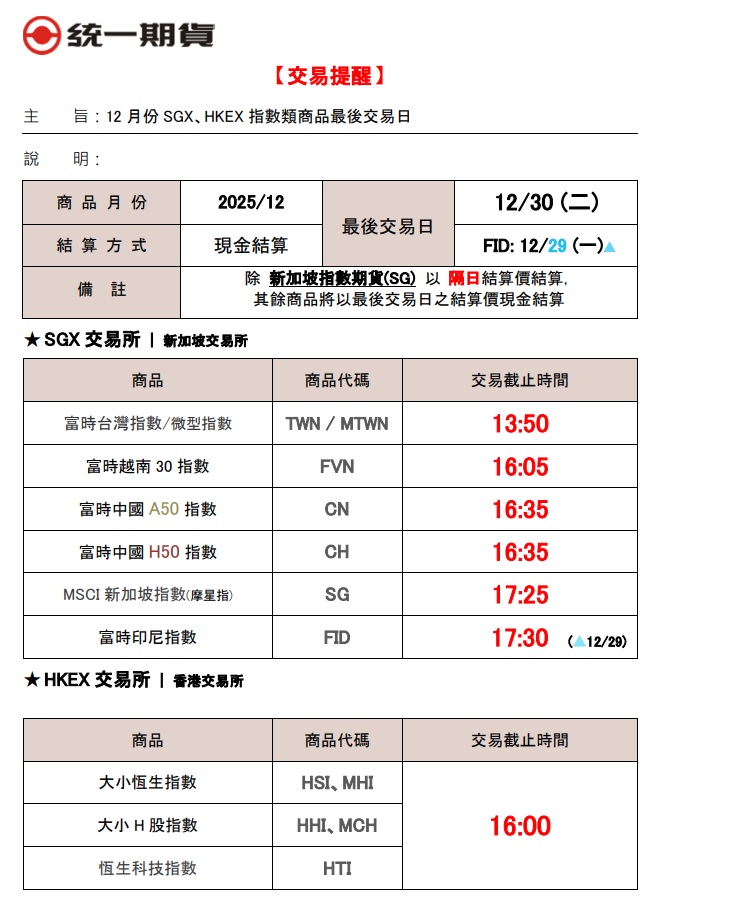 【交易提醒】12月份SGX、HKEX指數類商品最後交易日