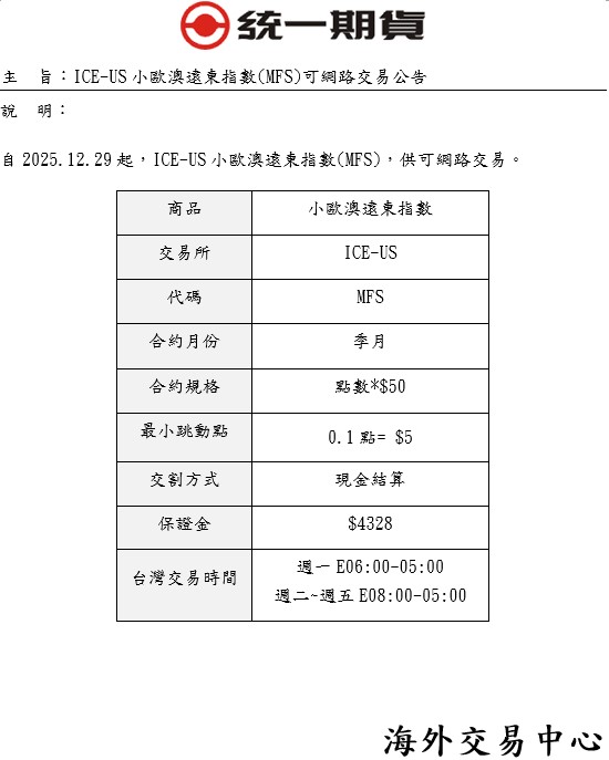 【公告】ICE-US 小歐澳遠東指數(MFS)可網路交易公告