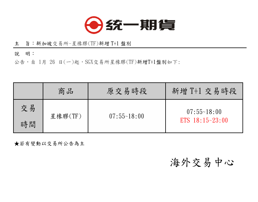 【交易提醒】新加坡交易所-星橡膠(TF)新增T+1盤別