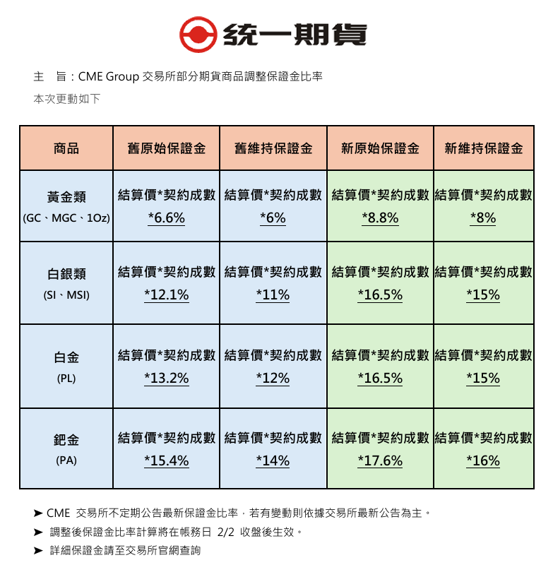 交易提醒:CME Group交易所部分期貨商品調整保證金比率
