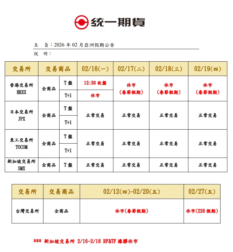 【交易提醒】2026年02月亞洲假期公告