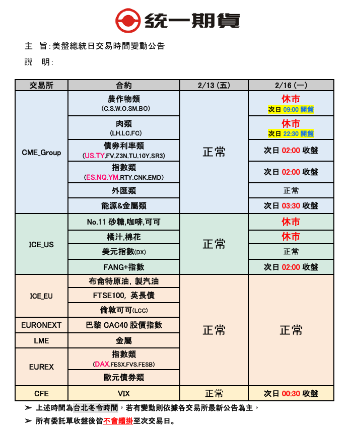 【交易提醒】美盤總統日交易時間變動公告