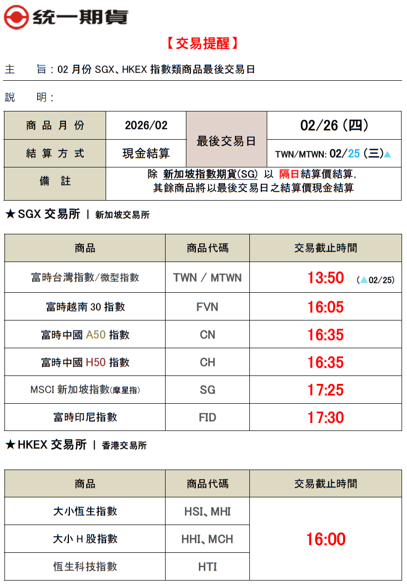 【交易提醒】02月份SGX、HKEX指數類商品最後交易日