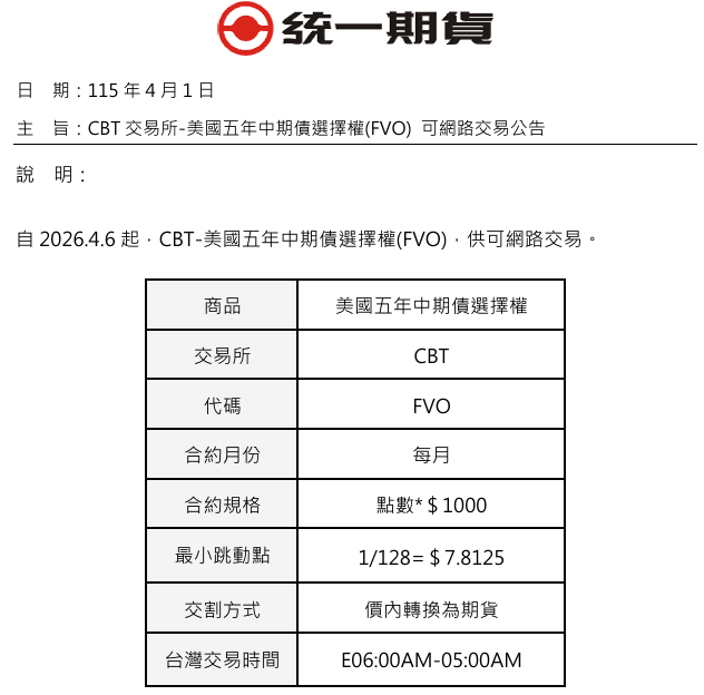 CBT交易所-美國五年中期債選擇權(FVO) 可網路交易公告