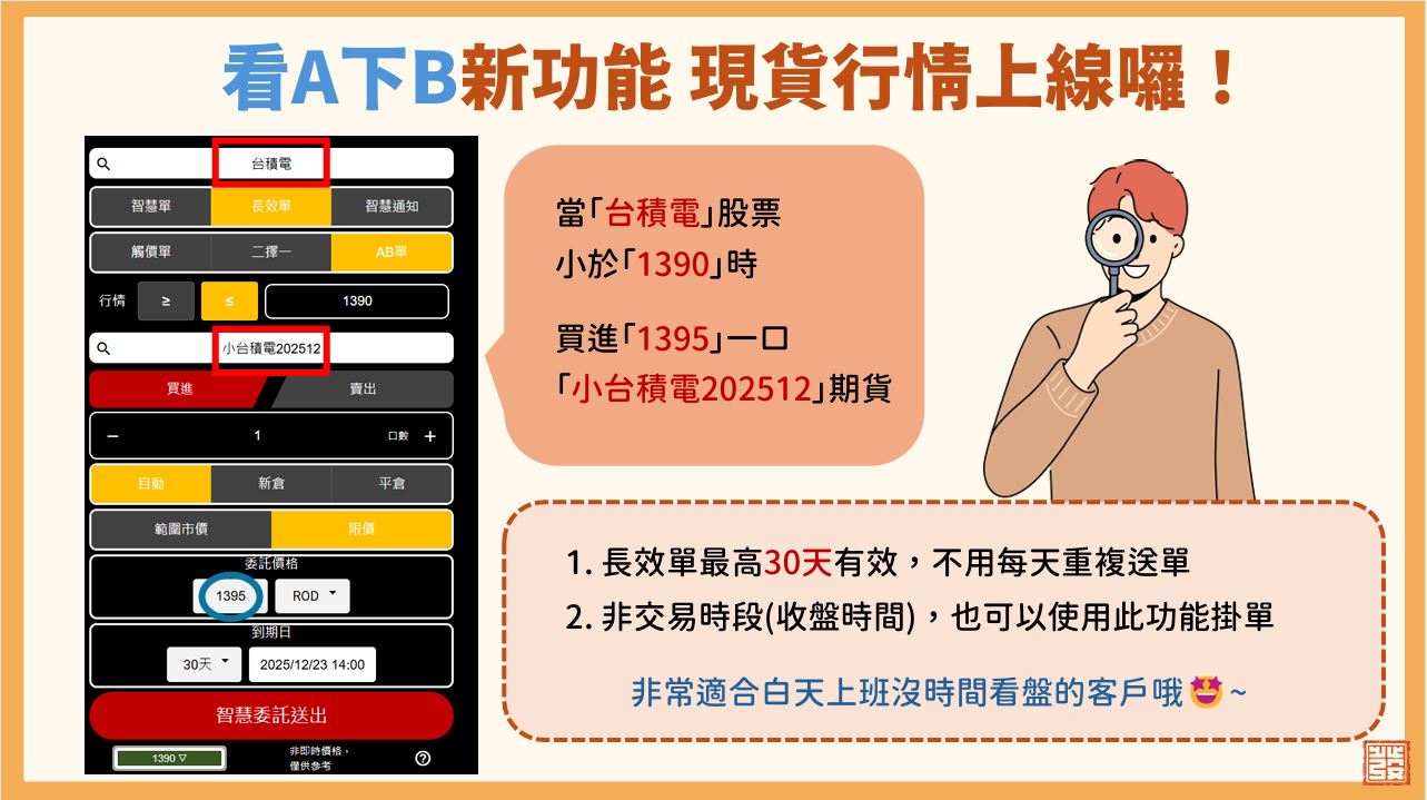 可跨盤別、長天數的智慧單,系統預設為30天,最長天數為30天。送出委託後即開始洗價,到期日14:00自動失效,不再洗價。