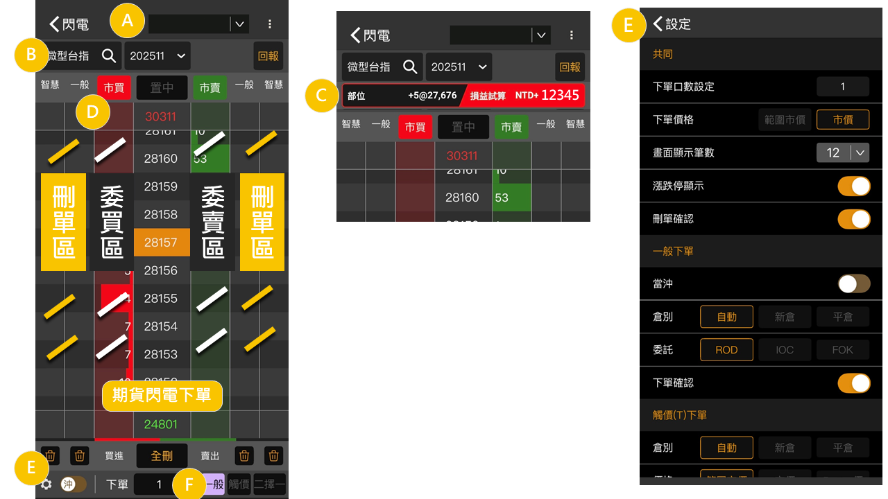 期貨、選擇權與國外期貨閃電下單介面大致皆相同(參考上圖)
