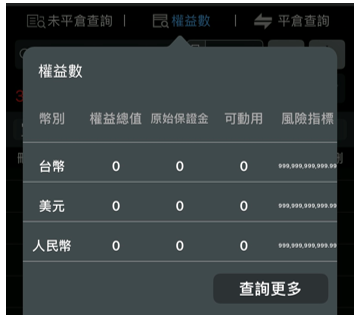 查詢帳戶資金狀況,包含幣別、權益總值、原始保證金、可動用保證金、風險指標,避免因市場波動而低估期貨交易風險。