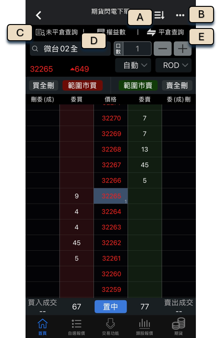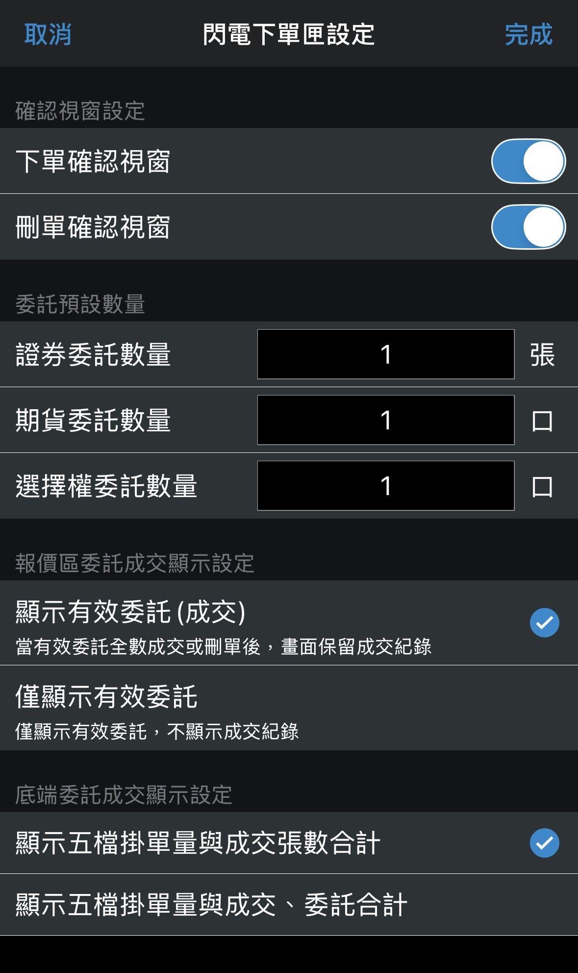 設定:閃電下單匣設定,包含是否關閉下單確認視窗與刪單確認視窗、委託預設數量、委託成交顯示設定、五檔掛單顯示設定。